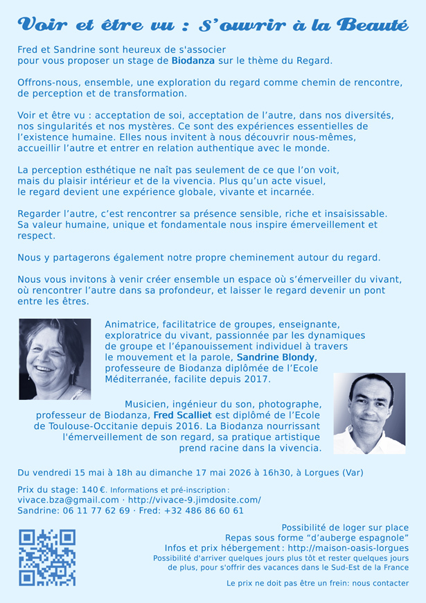 Prochain stage du 15 (au soir) au 17 mai 2026 : animé par Sandrine Blondy et Fred Scalliet
